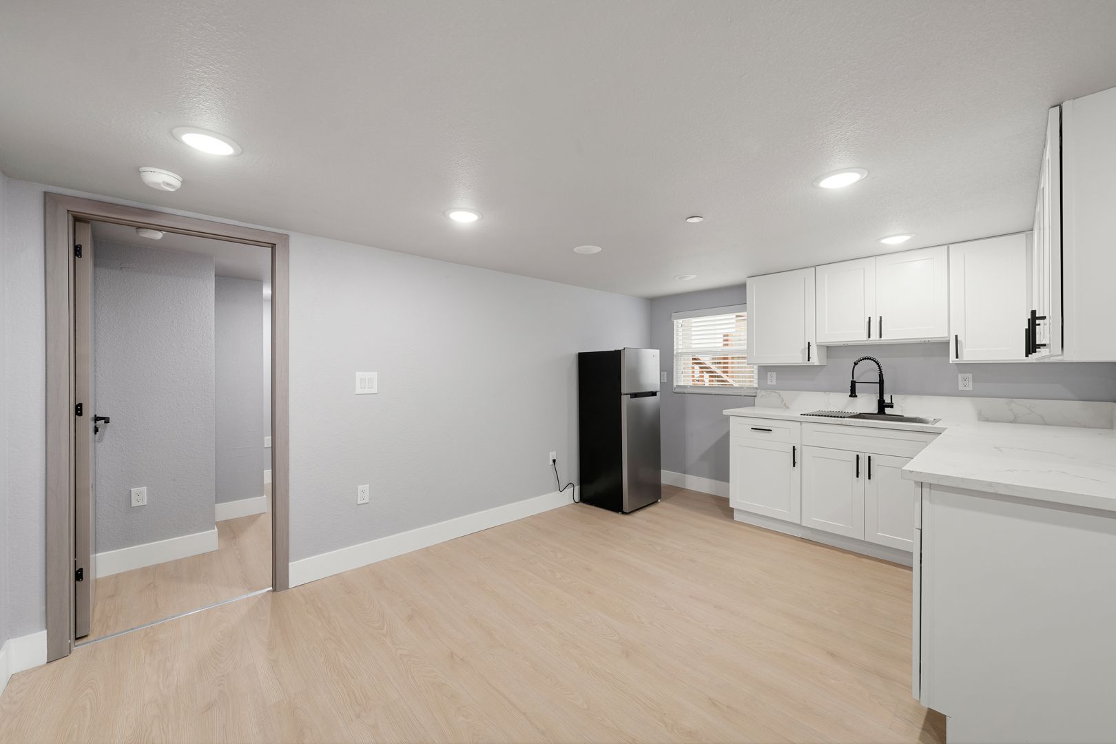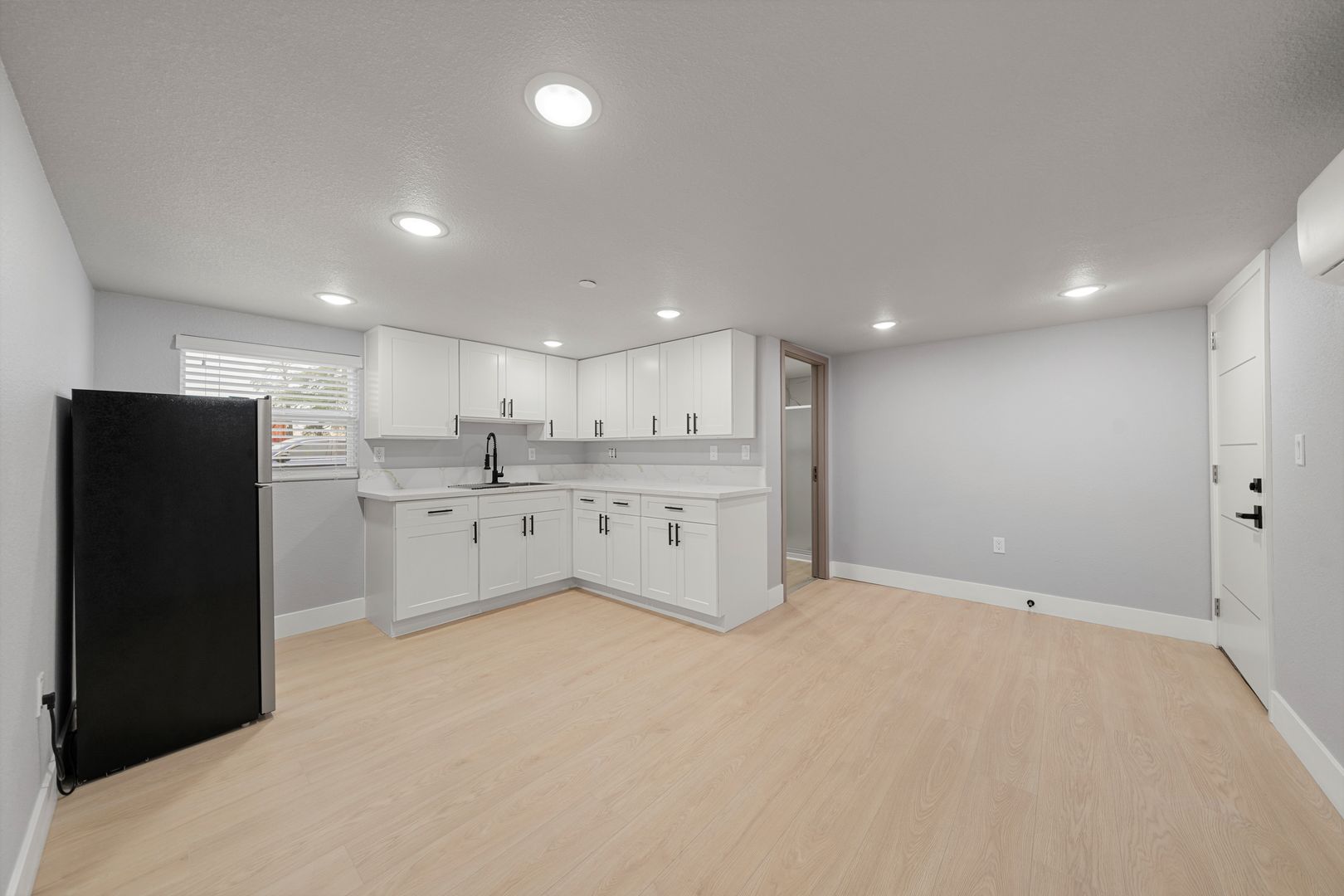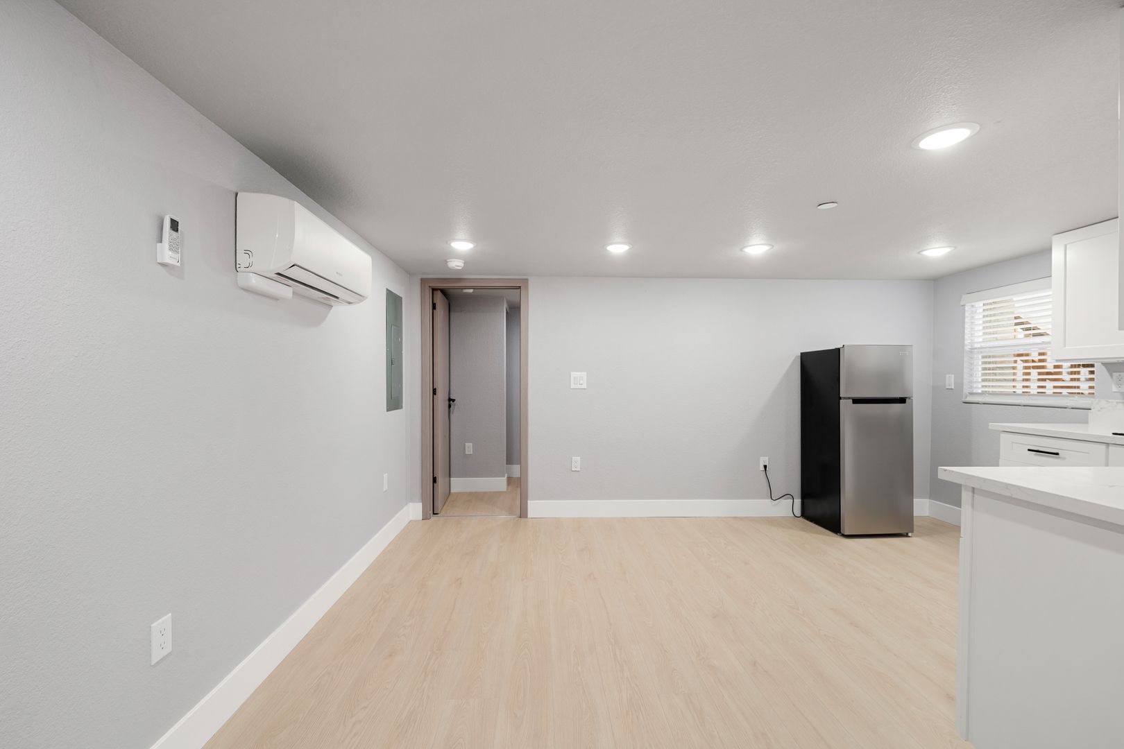 This brand-new one-bedroom, one-bath home offers modern comfort with clean, contemporary finishes. The kitchen features stainless steel appliances, including a refrigerator, paired with attractive vinyl plank wood countertops for a warm, modern look.