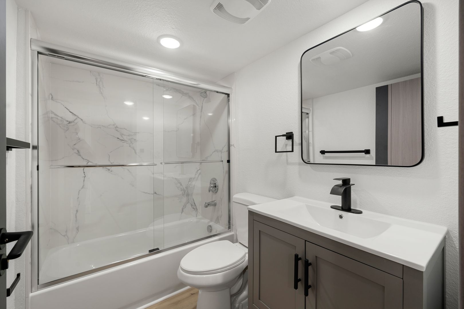 Relax and unwind in the well-appointed bathroom featuring a tub and shower combination. With an open, thoughtfully designed layout and fresh new construction, this studio delivers comfort, style, and convenience.