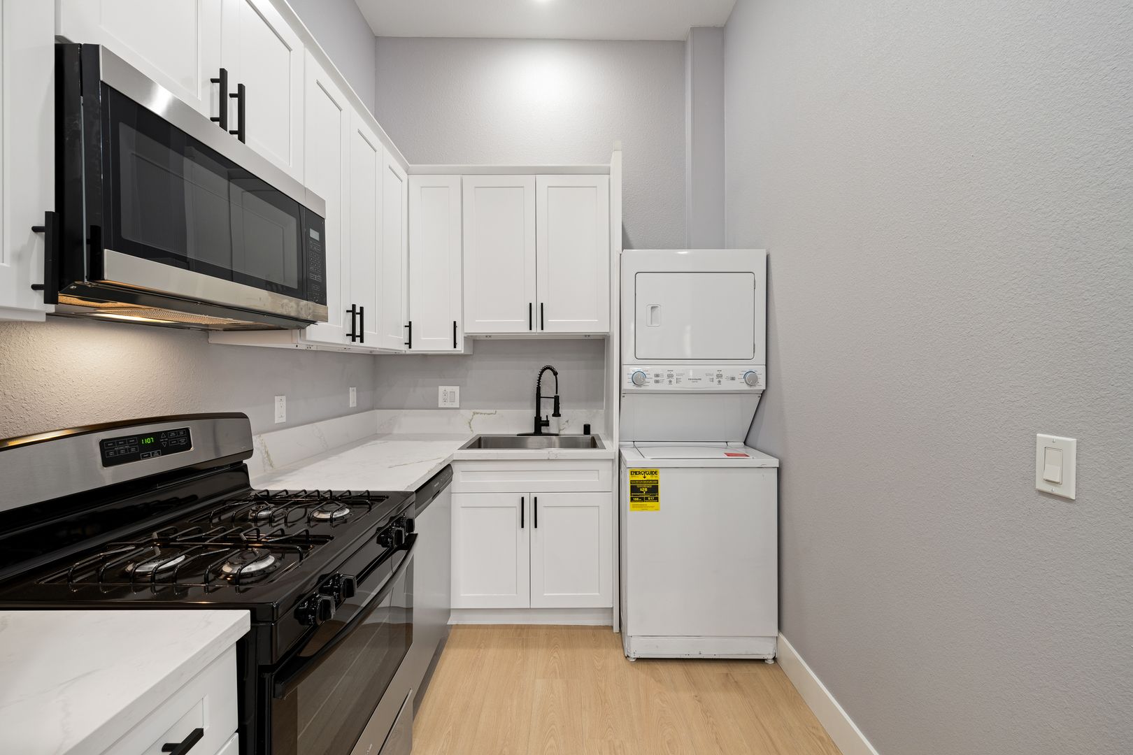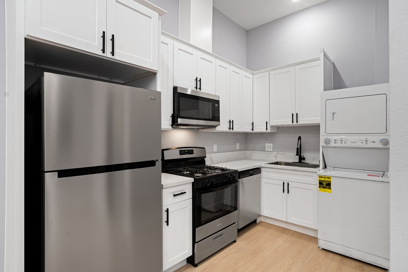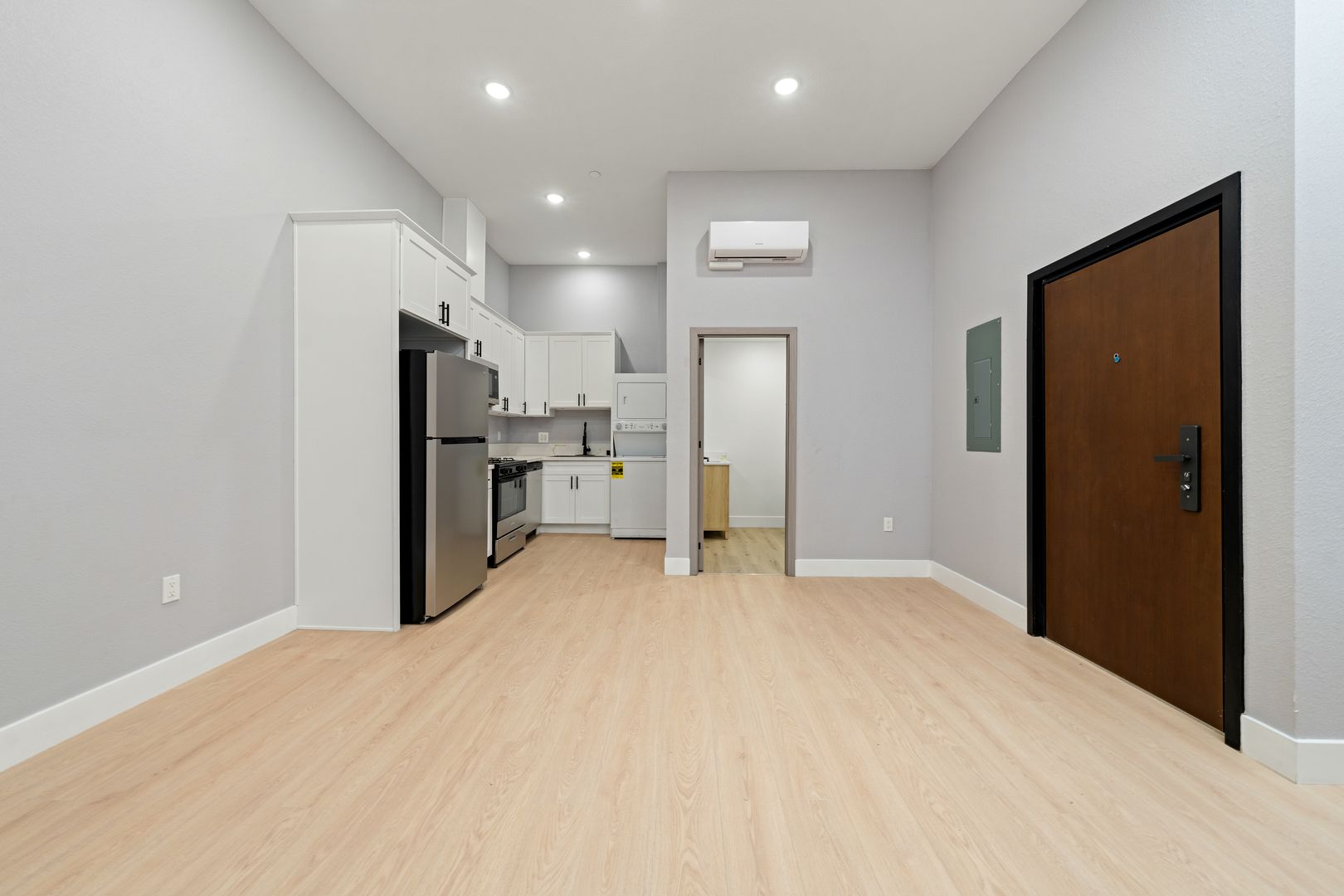 Welcome to this brand-new two-bedroom, one-bath residence designed with comfort and style in mind. Enjoy a modern kitchen featuring full-size stainless steel appliances, including a refrigerator, microwave, dishwasher, and gas stove, along with the convenience of an in-unit washer and dryer.
